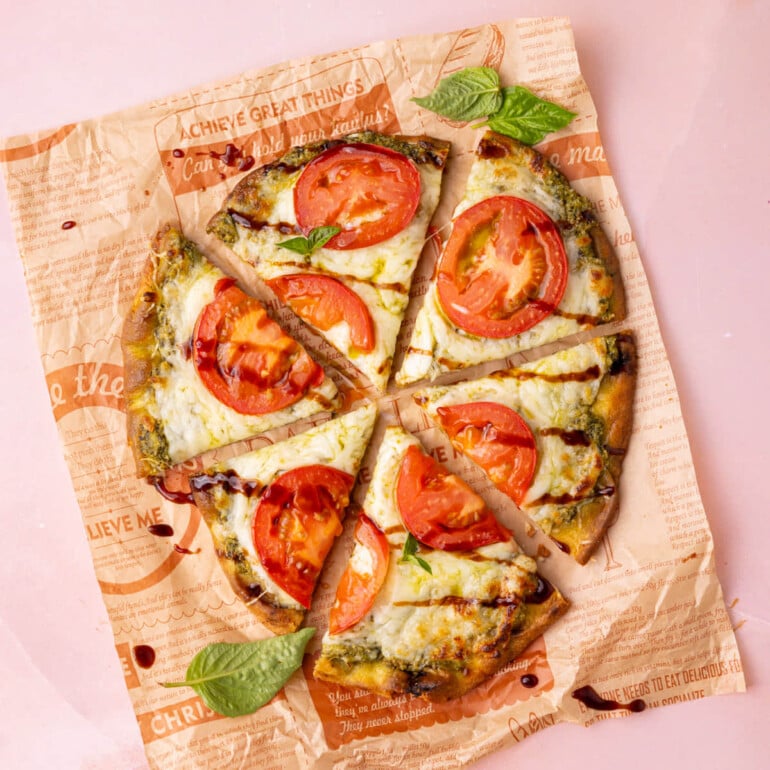 If you need to get food on the table fast, this super-easy Pesto Naan Pizza is for you! An oven-crisped naan coated generously in fresh, garlicky pesto acts as the base for the melty cheese and fresh, juicy tomato. Finished with balsamic glaze brings the perfect tangy-sweet finish.